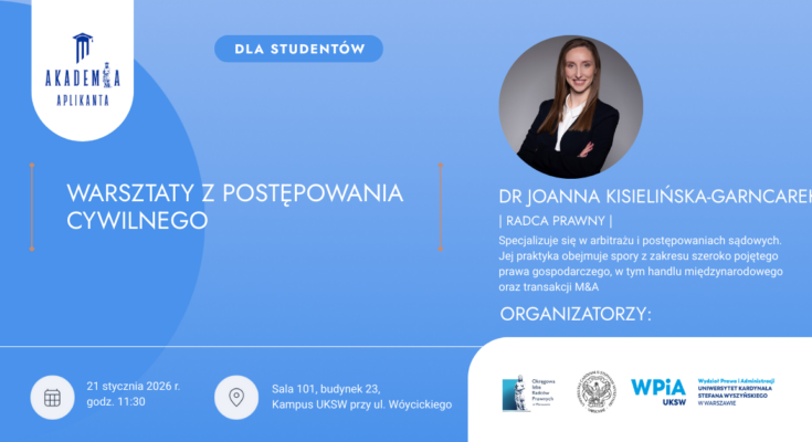 Zapraszamy studentów prawa na warsztaty z postępowania cywilnego. W środę, 21 stycznia o godz. 11:30 na UKSW spotkanie poprowadzi r. pr. Joanna Kisielińska-Garncarek z OIRP w Warszawie.