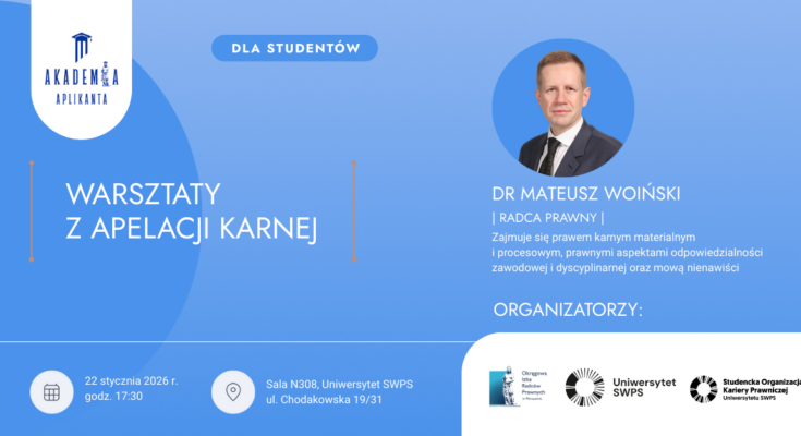 Zapraszamy studentów prawa na warsztaty z apelacji karnej. W czwartek, 22 stycznia o godz. 17:30 na SWPS spotkanie poprowadzi r. pr. dr Mateusz Woiński, członek OIRP w Warszawie.