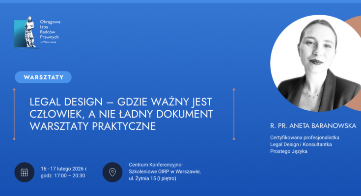 OIRP w Warszawie ponownie zaprasza radców prawnych oraz aplikantów radcowskich do udziału w dwudniowych warsztatach poświęconych tematyce legal design. Zajęcia odbędą się 16 i 17 lutego 2026 r. w godz.