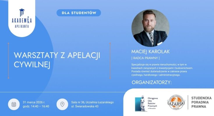 Zapraszamy studentów prawa na zajęcia dotyczące praktycznych aspektów postępowania cywilnego, w szczególności sporządzania środków zaskarżenia. We wtorek, 31 marca o godz.