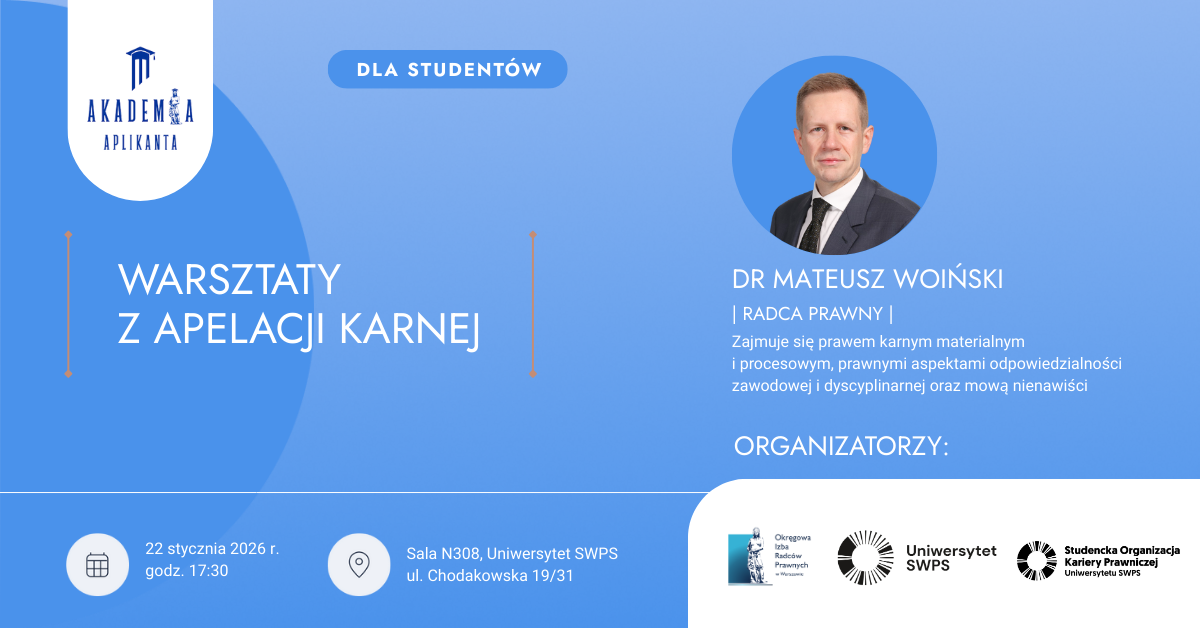 Zapraszamy studentów prawa na warsztaty z apelacji karnej. W czwartek, 22 stycznia o godz. 17:30 na SWPS spotkanie poprowadzi r. pr. dr Mateusz Woiński, członek OIRP w Warszawie.