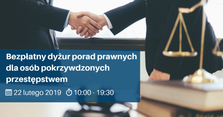 22 lutego 2019 r. w godzinach 10:00–19:30 w siedzibie Okręgowej Izby Radców Prawnych w Warszawie będziemy prowadzić dyżur bezpłatnych porad prawnych dla osób, które ucierpiały w wyniku przestępstw. Dyżur jest częścią obchodów Tygodnia Pomocy Osobom Pokrzywdzonym Przestępstwem, organizowanego przez Ministerstwo Sprawiedliwości.