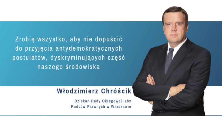W sytuacji gwałtownych przemian w otoczeniu społecznym i ustrojowym liderzy części izb chcą, aby Nadzwyczajny Krajowy Zjazd Radców Prawnych zajął się analizą „kto kosztem kogo”, przedkładając rozgrywki personalne nad interes samorządu i jego członków. Zrobię wszystko, aby nie dopuścić do przyjęcia antydemokratycznych postulatów, dyskryminujących część naszego środowiska – Włodzimierz Chróścik, Dziekan Rady OIRP w Warszawie.