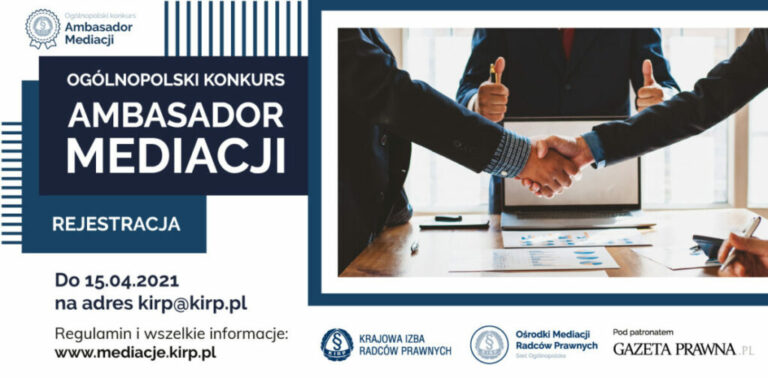 Rozpoczęła się kolejna odsłona ogólnopolskiego konkursu „Ambasador Mediacji”, którego organizatorem jest Krajowa Rada Radców Prawnych oraz ośrodki mediacji zrzeszone w Ogólnopolskiej Sieci ,,Ośrodki Radców Prawnych”. Już po raz drugi wybrana zostanie osoba lub podmiot, który przyczynił się do spopularyzowania instytucji mediacji, w sposób szczególny ją wykorzystał lub promował. Zgłaszanie kandydatur trwa do 15 kwietnia 2021 roku.