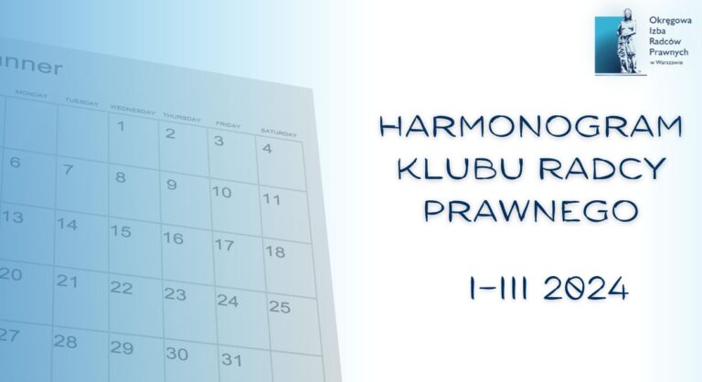 Poniżej przedstawiamy harmonogram aktywności Klubu Radcy Prawnego Okręgowej Izby Radców Prawnych w Warszawie w okresie od stycznia do marca 2024 roku. Szczegółowych informacji nt. wydarzeń udziela pani Krystyna Janicz.