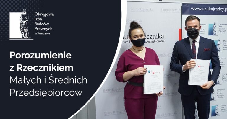 W środę, 9 grudnia 2020 r., doszło do podpisania porozumienia między Okręgową Izbą Radców Prawnych w Warszawie a Rzecznikiem Małych i Średnich Przedsiębiorców. Współpraca między tymi instytucjami będzie dotyczyła między innymi wspólnej organizacji specjalistycznych szkoleń.