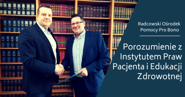 W trakcie oficjalnego spotkania, na którym podpisano porozumienie, Radcowski Ośrodek Pomocy Pro Bono był reprezentowany przez Dziekana Rady OIRP w Warszawie, Włodzimierza Chróścika – Instytut Praw Pacjenta i Edukacji Zdrowotnej to fundacja znana z działań na rzecz zwiększenia świadomości społecznej w temacie praw przysługującym polskim pacjentom. Dla wielu z nich to pierwsza i jedyna organizacja do jakiej mogą zwrócić się po pomoc w beznadziejnej sytuacji. Cieszymy się, że możemy wesprzeć Instytut w jego szlachetnej misji – komentuje Dziekan Rady Izby warszawskiej.