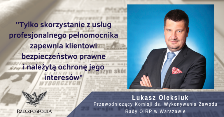 Radca prawny zwraca uwagę, że radcy prawni i adwokaci podlegają surowym zasadom etyki zawodowej oraz są zobowiązani tajemnicą zawodową. – Radcy prawni i adwokaci podlegają obowiązkowemu ubezpieczeniu od odpowiedzialności cywilnej – podkreśla Łukasz Oleksiuk oraz dodaje, że tylko skorzystanie z usług profesjonalnego pełnomocnika zapewnia klientowi bezpieczeństwo prawne i należytą ochronę jego interesów.