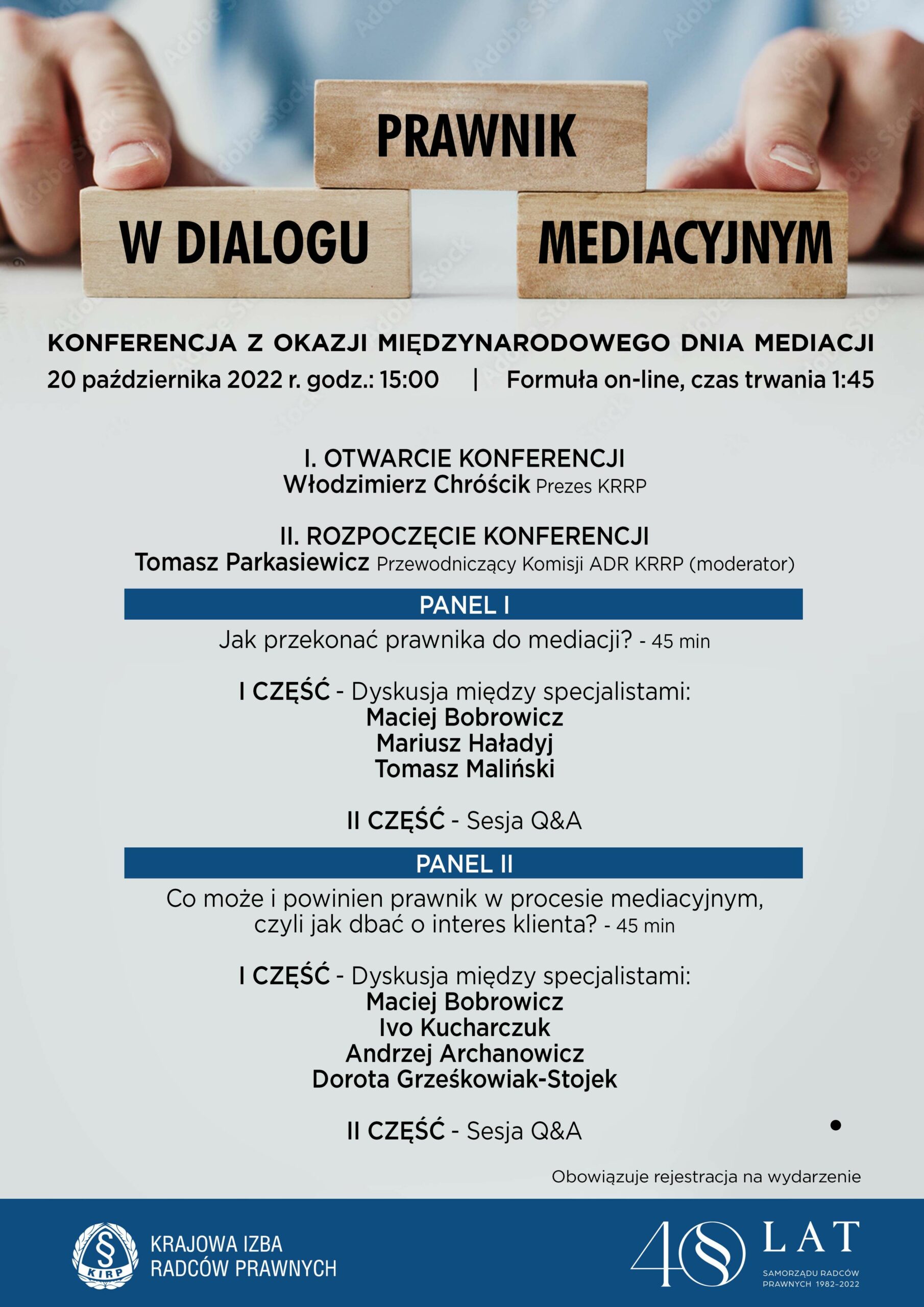 Data konferencji nie jest przypadkowa – 20 października obchodzony jest Międzynarodowy Dzień Mediacji – tego dnia o godz. 15.00 KIRP zaprasza na bezpłatne, dostępne dla wszystkich zainteresowanych wydarzenie w formule online.