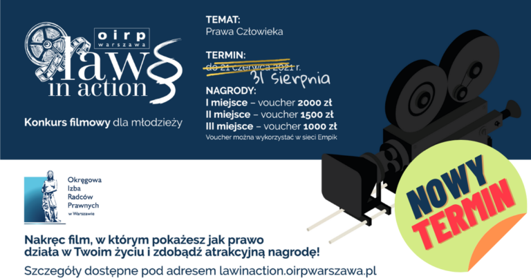Informujemy, że Organizator konkursu – Okręgowa Izba Radców Prawnych w Warszawie podjęła decyzję o przedłużeniu terminu na składanie zgłoszeń młodzieży do Konkursu wraz z materiałem filmowych do dnia 31 sierpnia 2021 r. włącznie.