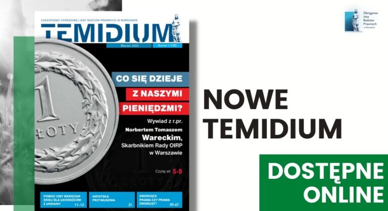 Na stronie kwartalnika Okręgowej Izby Radców Prawnych w Warszawie dostępne jest nowe e-wydanie Temidium. W numerze znajdą Państwo m.in.: wywiad ze Skarbnikiem Rady OIRP w Warszawie Norbertem Tomaszem Wareckim, omówienie pomocy Izby warszawskiej dla uchodźców z Ukrainy oraz omówienie kwestii praw zwierząt.
