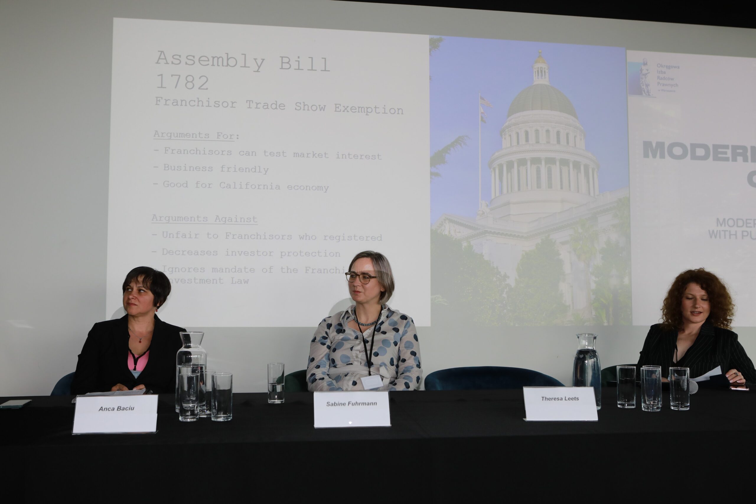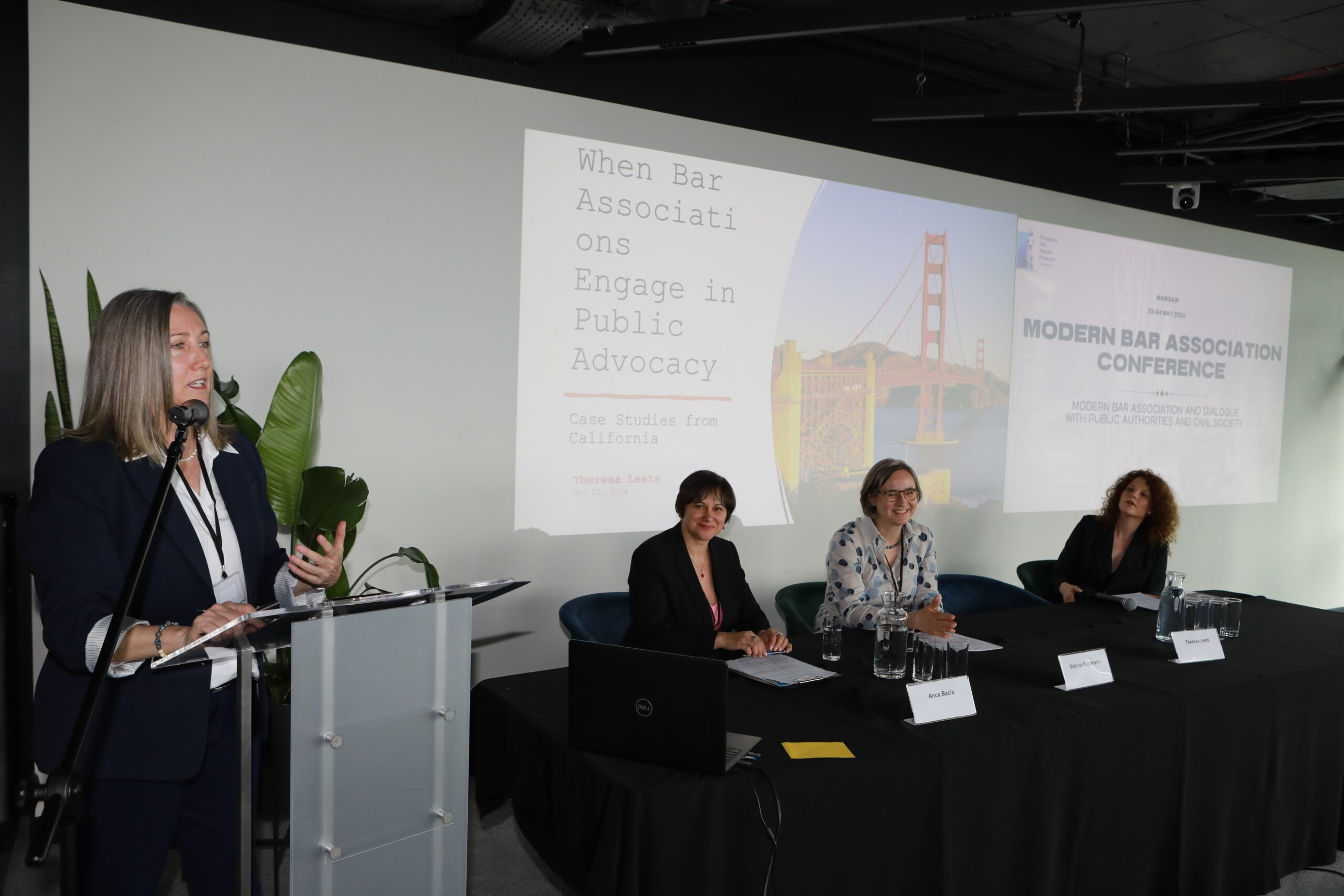 I panel zaczął się od wystąpienia Theresy Leets, wiceprzewodniczącej Sekcji Prawa Międzynarodowego i Imigracji Kalifornijskiego Stowarzyszenia Prawników, która przedstawiła studia przypadków z Kalifornii na temat angażowania się izby kalifornijskiej w działania społeczne.