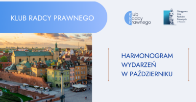 Przedstawiamy harmonogram aktywności Klubu Radcy Prawnego Okręgowej Izby Radców Prawnych w Warszawie w październiku 2025 roku. Szczegółowych informacji nt. wydarzeń udziela pani Angelika Gumińska: guminska.a@oirpwarszawa.