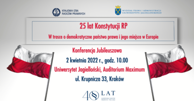 Krajowa Izba Radców Prawnych we współpracy z Wydziałem Prawa i Administracji Uniwersytetu Jagiellońskiego zaprasza na Jubileuszową Konferencję „25 lat Konstytucji RP: w trosce o demokratyczne państwo prawa i jego miejsce w Europie”.