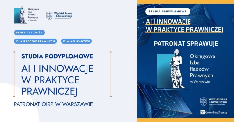 Izba warszawska objęła patronatem studia podyplomowe „AI i Innowacje w Praktyce Prawniczej”, realizowane przez Wydział Prawa i Administracji Uniwersytetu Warszawskiego.