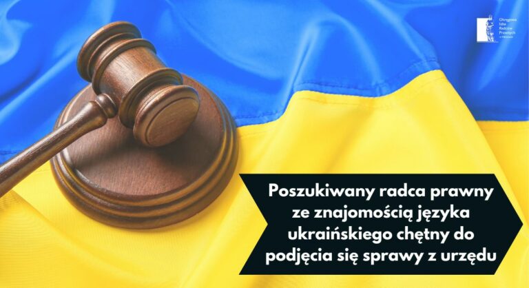 Rada OIRP w Warszawie poszukuje radców prawnych wpisanych na listę radców prawnych prowadzoną przez Radę Okręgowej Izby Radców Prawnych w Warszawie, którzy posługują się językiem ukraińskim w celu podjęcia się sprawy z urzędu przed Sądem Okręgowym Warszawa–Praga w Warszawie, VII Wydział Pracy i Ubezpieczeń.