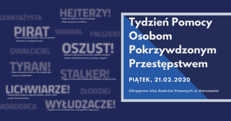 W dniach od 21 do 28 lutego 2020 r. obchodzony będzie „Tydzień Pomocy Osobom Pokrzywdzonym Przestępstwem”, w którym aktywny udział weźmie m.in. stołeczny samorząd radców prawnych. W piątek 21 lutego br., Izba warszawska zorganizuje w swojej siedzibie specjalny dyżur, podczas którego członkowie samorządu będą świadczyć bezpłatną pomoc prawną osobom, które ucierpiały w wyniku przestępstw.