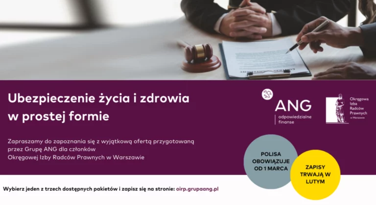 Grupa ubezpieczeniowa ANG przygotowała specjalną ofertę ubezpieczenia grupowego dla radców prawnych, aplikantów radcowskich oraz pracowników biura Okręgowej Izby Radców Prawnych w Warszawie.