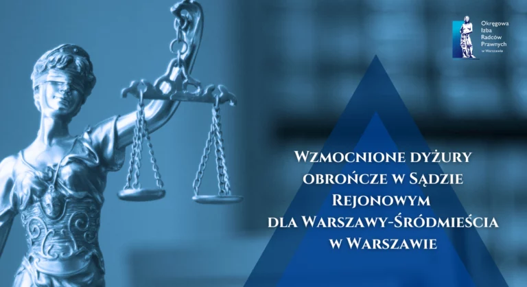 W związku pismem Wiceprezesa Sądu Rejonowego dla Warszawy-Śródmieścia w Warszawie, Rada OIRP w Warszawie poszukuje radców prawnych, uprawnionych do pełnienia funkcji obrońcy w sprawach karnych, którzy w dniach 11-14 listopada 2024 r. podjęliby się pełnienia dodatkowych dyżurów obrończych w ww. Sądzie.