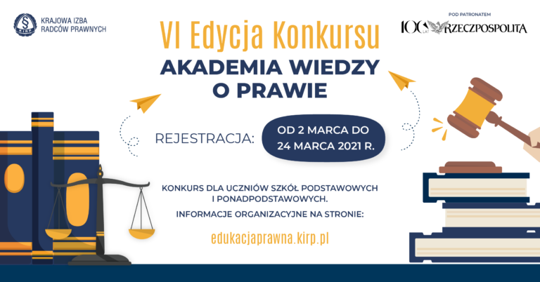 Już szósty rok z rzędu uczniowie klas V-VIII szkół podstawowych i ponadpodstawowych będą mogli sprawdzić swoją wiedzę prawniczą i zmierzyć się z innymi w ogólnopolskim konkursie „Akademia Wiedzy o Prawie” organizowanym przez Krajową Izbę Radców Prawnych. Rejestracja uczestników potrwa do 24 marca 2021 roku. Tegoroczna edycja odbędzie się w całości on-line.