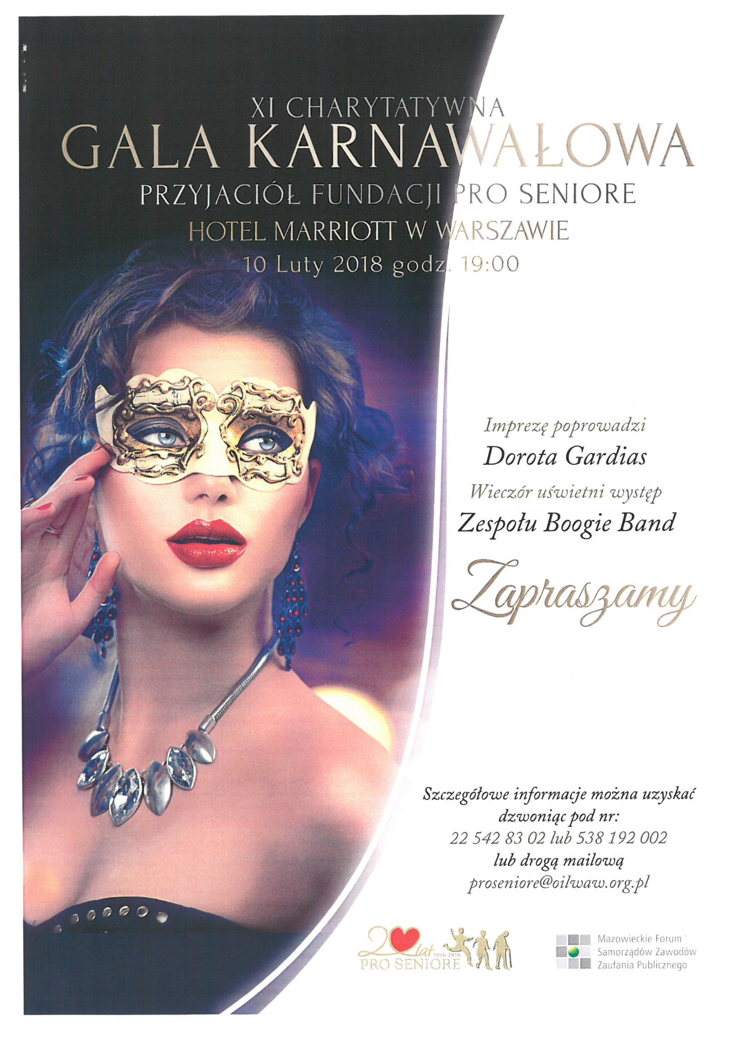 10 lutego 2018 roku w Hotelu Martiott w Warszawie odbędzie się XI Charytatywna Gala Karnawałowa Przyjaciół Fundacji Pro Seniore, podczas której zbierane będą fundusze na realizację celów statutowych Fundacji.