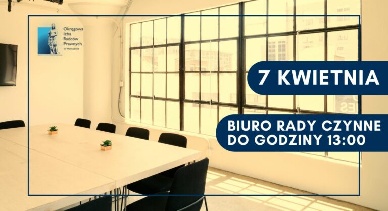 Uprzejmie informujemy, że w najbliższy piątek, 7 kwietnia 2023 roku, Biuro Rady Okręgowej Izby Radców Prawnych w Warszawie będzie czynne do godziny 13:00.