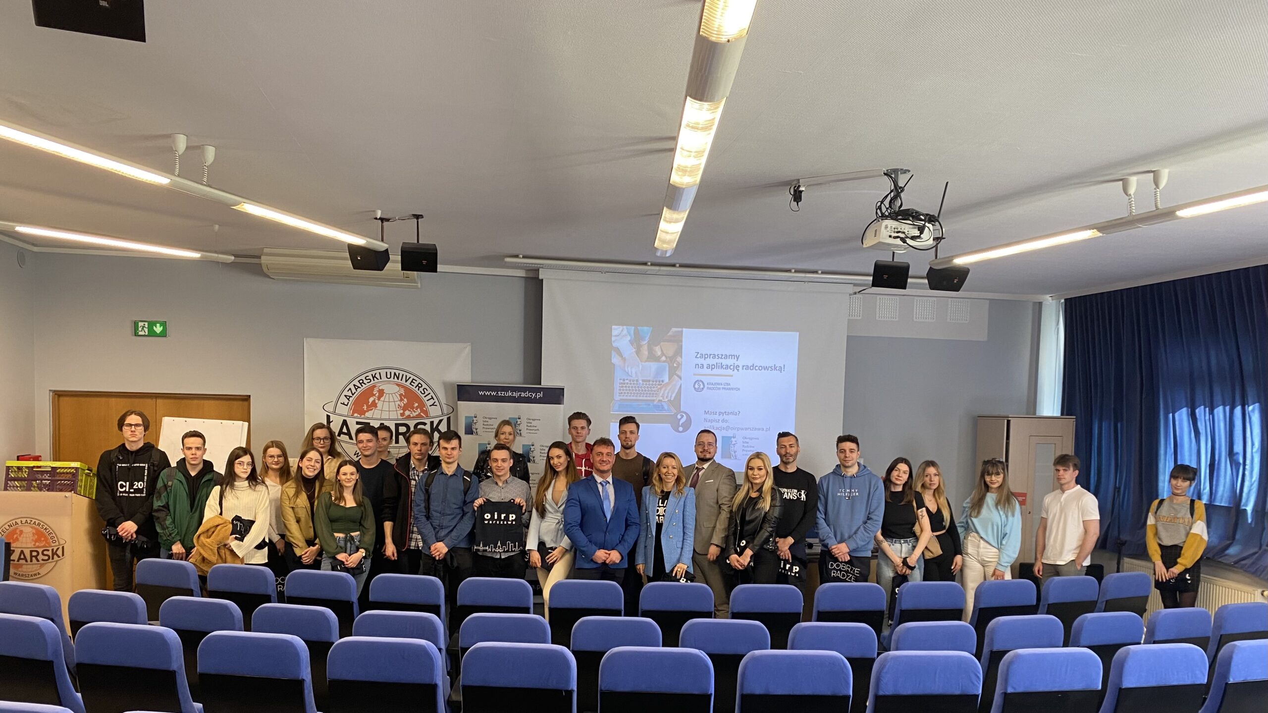 Pierwsze spotkanie odbyło się 20 kwietnia na Uczelni Łazarskiego, gdzie niemal 50 studentów prawa z zainteresowaniem słuchało radcy prawnego Szymona Jelonka oraz aplikanta radcowskiego Mariusza Pawlaka.
