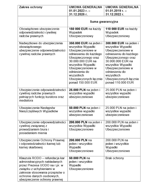 Informujemy, że w dniu 21.12.2022 roku pomiędzy Krajową Izbą Radców Prawnych a UNIQA TU S.A. przy udziale brokera ubezpieczeniowego Willis Towers Watson Sp. z o.o. została zawarta nowa Umowa Generalna w sprawie programu ubezpieczeniowego dla radców prawnych na lata 2023–2026.