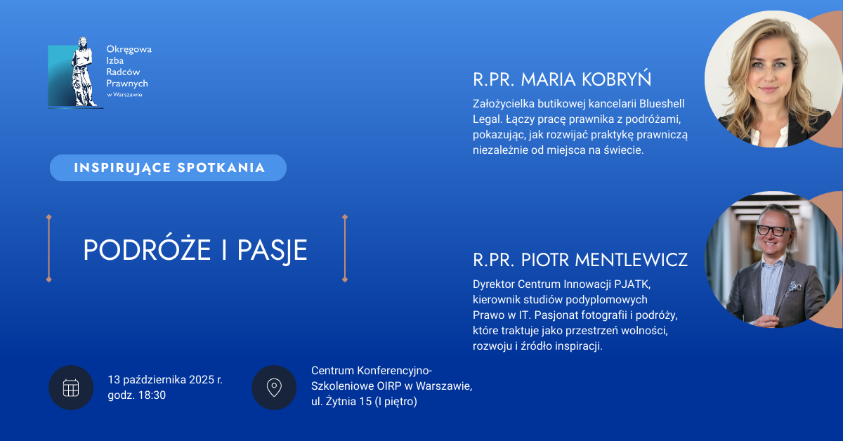 Okręgowa Izba Radców Prawnych w Warszawie zaprasza radców prawnych i aplikantów radcowskich na cykl wydarzeń pod nazwą „Inspirujące spotkania z radcami prawnymi”.