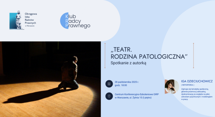 OIRP w Warszawie zaprasza na spotkanie z Igą Dzieciuchowicz – autorką książki „Teatr. Rodzina patologiczna”. Wydarzenie odbędzie się 28 października w Centrum Konferencyjno-Szkoleniowym OIRP w Warszawie przy ul. Żytniej 15.