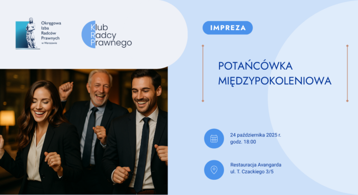 Klub Radcy Prawnego OIRP w Warszawie zaprasza członków Izby warszawskiej na Potańcówkę Międzypokoleniową. Wydarzenie odbędzie się 24 października 2025 r. (piątek) w Restauracji Avangarda przy ul. Czackiego 3/5 w Warszawie, początek o godz. 18:00.