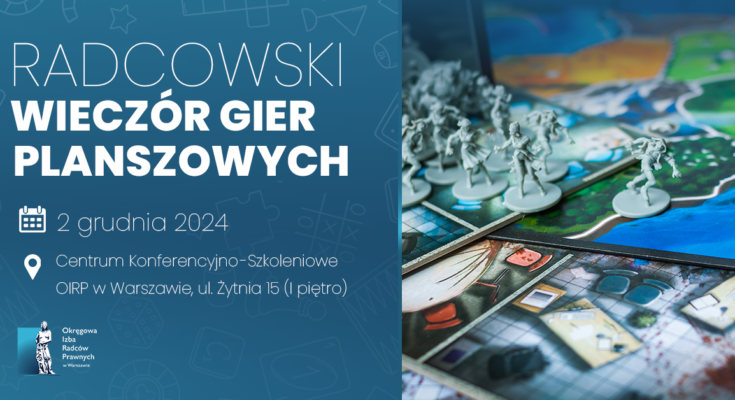 Zapraszamy wszystkich radców prawnych i aplikantów radcowskich na kolejne spotkanie w ramach „Radcowskich wieczorów gier planszowych”, które odbędzie się: 2 grudnia, w godzinach 18:00-22:00, w siedzibie OIRP w Warszawie, przy ul.