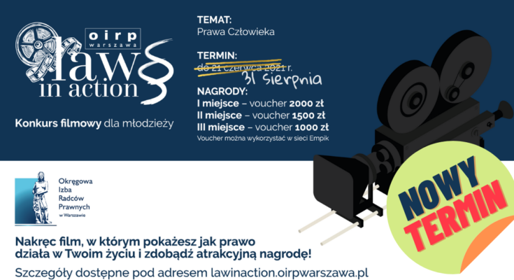 Informujemy, że Organizator konkursu – Okręgowa Izba Radców Prawnych w Warszawie podjęła decyzję o przedłużeniu terminu na składanie zgłoszeń młodzieży do Konkursu wraz z materiałem filmowych do dnia 31 sierpnia 2021 r. włącznie.