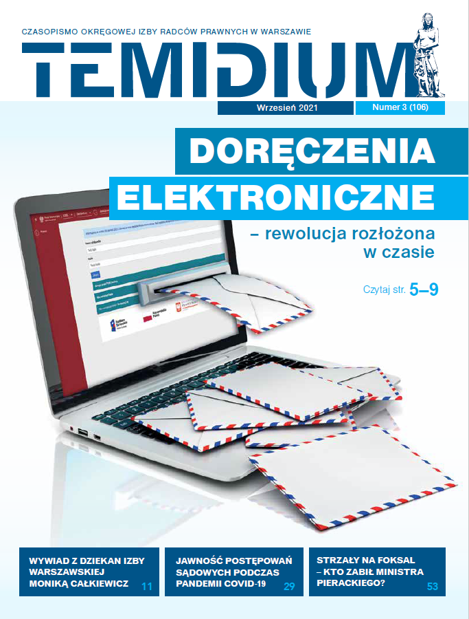Na stronie kwartalnika Okręgowej Izby Radców Prawnych w Warszawie dostępne jest nowe e-wydanie Temidium. W numerze znajdą Państwo m.in.: wywiad z Dziekan Rady OIRP w Warszawie Moniką Całkiewicz, wpływ reformy systemu doręczeń na radców prawnych oraz omówienie planowanych zmian na aplikacji radcowskiej w niedalekiej przyszłości.