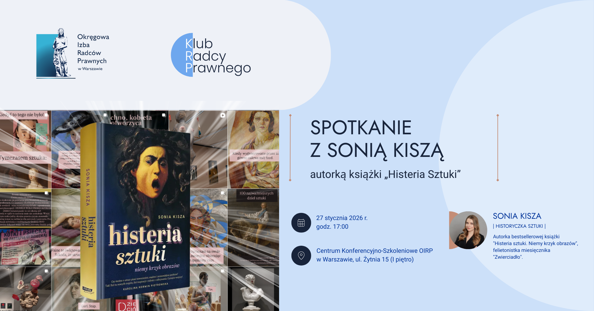 OIRP w Warszawie zaprasza radców prawnych oraz aplikantów radcowskich na wyjątkowe spotkanie z Sonią Kiszą – historyczką sztuki, felietonistką „Zwierciadła” oraz autorką bestsellerowej książki „Histeria sztuki. Niemy krzyk obrazów”. Rozmowę o tym, jak czytać ukryte symbole w malarstwie oraz o roli kobiet w sztuce, poprowadzi r. pr. Ewa Pietrzak.