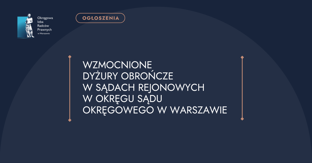 W związku z tegorocznymi obchodami Święta Niepodległości, Rada OIRP w Warszawie poszukuje radców prawnych, uprawnionych do pełnienia funkcji obrońcy w sprawach karnych, którzy w okresie 11-14 listopada 2025 r. zgłaszają gotowość do świadczenia pomocy prawnej przy rozpoznaniu wniosków o stosowanie środków zapobiegawczych w postaci tymczasowego aresztowania, zażaleń na zatrzymanie oraz spraw w trybie przyśpieszonym.
