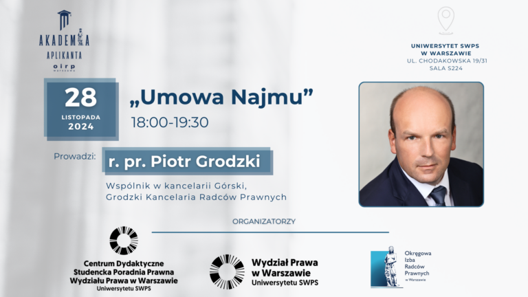 Już 28 listopada o godz. 18:00, w sali S224 Uniwersytetu SWPS w Warszawie (ul. Chodakowska 19/31) r. pr. Piotr Grodzki poprowadzi wykład pt. „Umowa najmu”.