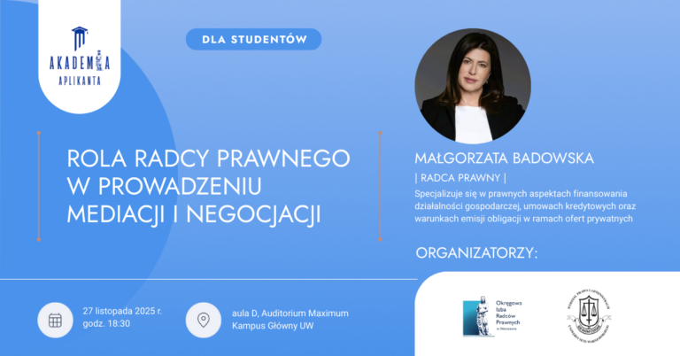 Już w czwartek, 27 listopada o godz. 18:30, w auli D Audytorium Maximum, (Kampus Główny UW) r. pr. Małgorzata Badowska, poprowadzi warsztaty pt. „Rola radcy prawnego w prowadzeniu mediacji i negocjacji”.