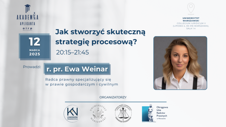 Już 12 marca o godz. 20:15, w Collegium Iuridicum II (ul. Lipowa 4, sala 1.4) r. pr. Ewa Weinar poprowadzi warsztaty pt. „Jak stworzyć skuteczną strategię procesową?”.