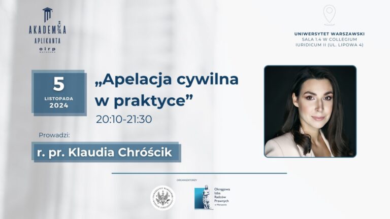 5 listopada 2024 r. o godz. 20:10 na Wydziale Prawa i Administracji UW odbędzie się kolejny wykład z cyklu „Akademia Aplikanta” OIRP w Warszawie. Na spotkanie, dzięki któremu będzie można bliżej poznać aplikację radcowską w Izbie warszawskiej, zapraszamy wszystkich zainteresowanych studentów prawa.