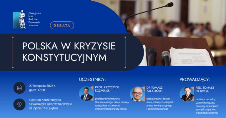 OIRP w Warszawie zaprasza na kolejną odsłonę cyklu Debat Radców Prawnych pt. „Polska w kryzysie konstytucyjnym”. Spotkanie odbędzie się 27 listopada 2025 r. w Centrum Konferencyjno-Szkoleniowym przy ul. Żytniej 15. Start o godzinie 17:00.