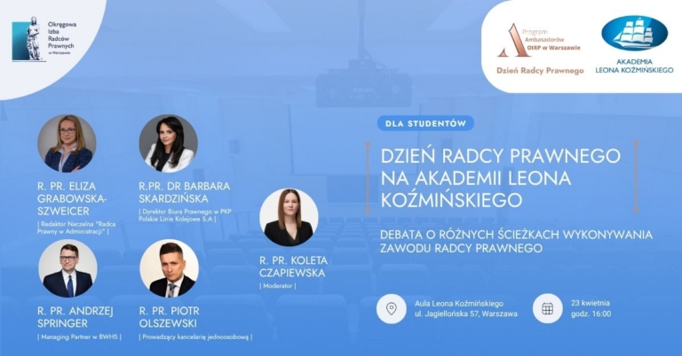 W czwartek 23 kwietnia o godz. 16:00 na Akademii Leona Koźmińskiego odbędzie się spotkanie w ramach Dni Radcy Prawnego. Wydarzenie to jest częścią projektu Ambasadorowie OIRP w Warszawie na uczelniach wyższych, realizowanego przez Izbę warszawską.