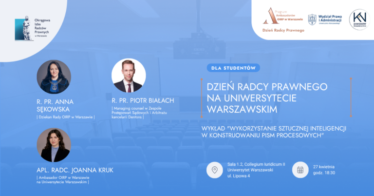 W poniedziałek 27 kwietnia o godz. 18:30 w Collegium Iuridicum II na Uniwersytecie Warszawskim odbędzie się dyskusja o aplikacji radcowskiej oraz warsztat pt. „Wykorzystanie sztucznej inteligencji w konstruowaniu pism procesowych”. Spotkanie jest realizowane przez OIRP w Warszawie, we współpracy z Uniwersytetem, w ramach cyklu „Dzień Radcy Prawnego” prowadzonego przez Izbę warszawską.