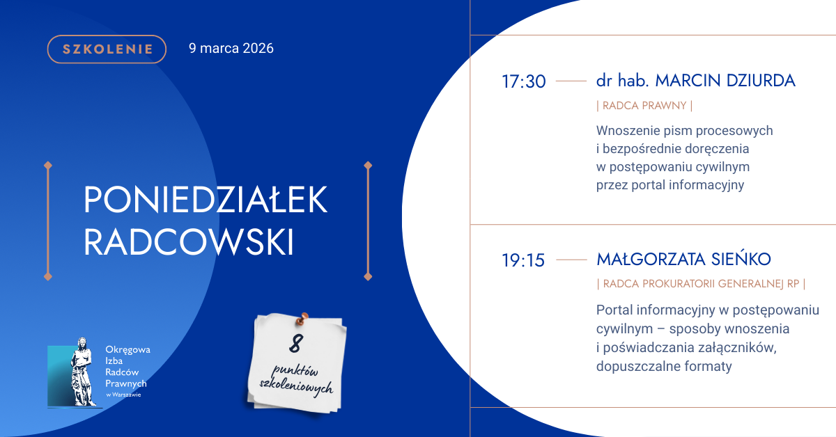 Zapraszamy na najbliższy poniedziałek radcowski – do zdobycia aż 8 punktów doskonalenia zawodowego!