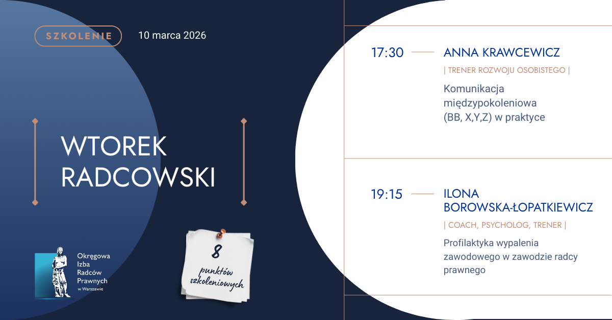 Zapraszamy na najbliższy wtorek radcowski – do zdobycia aż 8 punktów doskonalenia zawodowego!