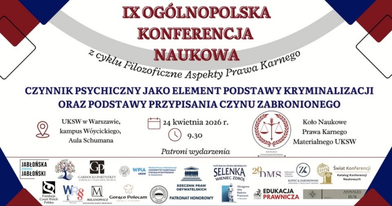 Konferencja „Czynnik psychiczny jako element podstawy kryminalizacji oraz podstawy przypisania czynu zabronionego”, odbędzie się 24 kwietnia 2026 r. organizowana jest przez Koło Naukowe Prawa Karnego Materialnego działające na Uniwersytecie Kardynała Stefana Wyszyńskiego w Warszawie.