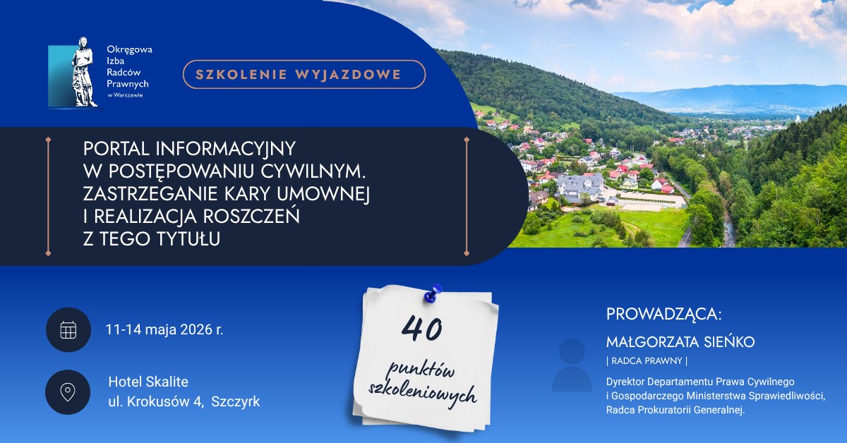 Administratorem jest Okręgowa Izba Radców Prawnych w Warszawie, ul. Żytnia 15 lok. 16, 01-014 Warszawa. Przysługuje Pani/Panu prawo do żądania od administratora dostępu do danych osobowych, ich usunięcia lub ograniczenia przetwarzania, do wniesienia sprzeciwu wobec przetwarzania, w zakresie wynikającym z art. 15-22 RODO. Więcej o przetwarzaniu danych osobowych TUTAJ oraz w Polityce prywatności.