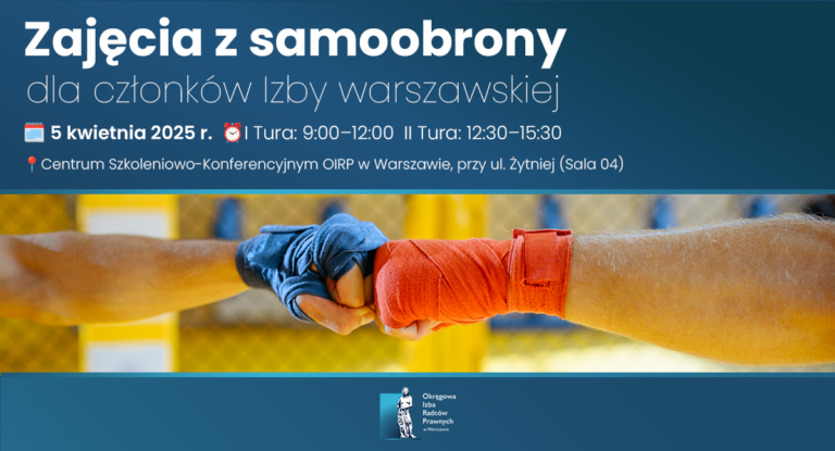 Zajęcia z samoobrony odbędą się 5 kwietnia (sobota) w Centrum Szkoleniowo-Konferencyjnym OIRP w Warszawie, przy ul. Żytniej 15 (I piętro, sala 04).