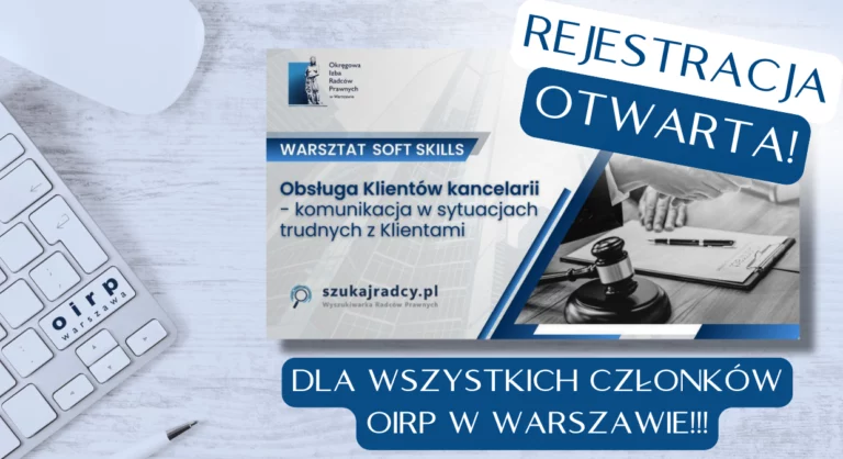 Zapraszamy wszystkich radców prawnych z Izby warszawskiej na warsztaty „Obsługa Klientów kancelarii – komunikacja w sytuacjach trudnych z Klientami”. To już trzecie szkolenie promujące portal SzukajRadcy.pl, które odbędzie się 2 września 2024 r., w godz. 9:00-16:30, w Centrum Konferencyjno-Szkoleniowym OIRP w Warszawie, przy ul. Żytniej 15 (I piętro).