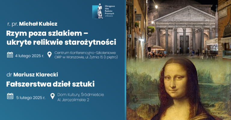 Pierwsze ze spotkań – zaplanowane na wtorek 4 lutego 2025 r. o godz. 16:00 w Centrum Konferencyjno-Szkoleniowym OIRP w Warszawie, przy ul. Żytniej 15 – to spotkanie z cyklu „Historia”. Podczas wykładu „Rzym poza szlakiem – ukryte relikwie starożytności” r. pr. Michał Kubicz, autor powieści historycznych o starożytnym Rzymie, zaprosi słuchaczy na unikalną podróż do serca Wiecznego Miasta, poza utarte turystyczne szlaki.